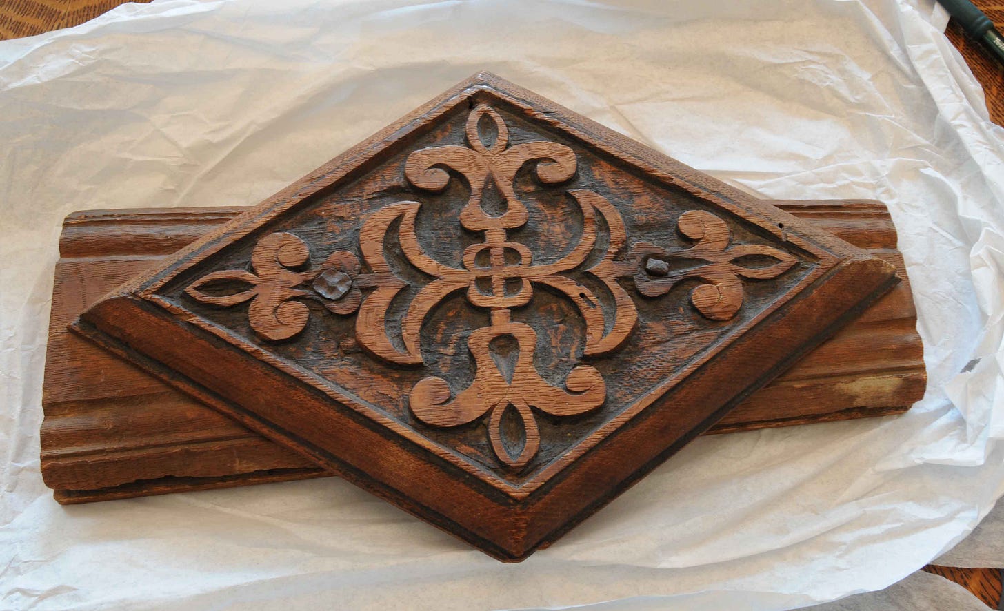 The “deske” is the pulpit, complete with pillars/balusters. The great pillars are perhaps those that support the raised pulpit. This panel is said to be a fragment that survives from that meeting house: