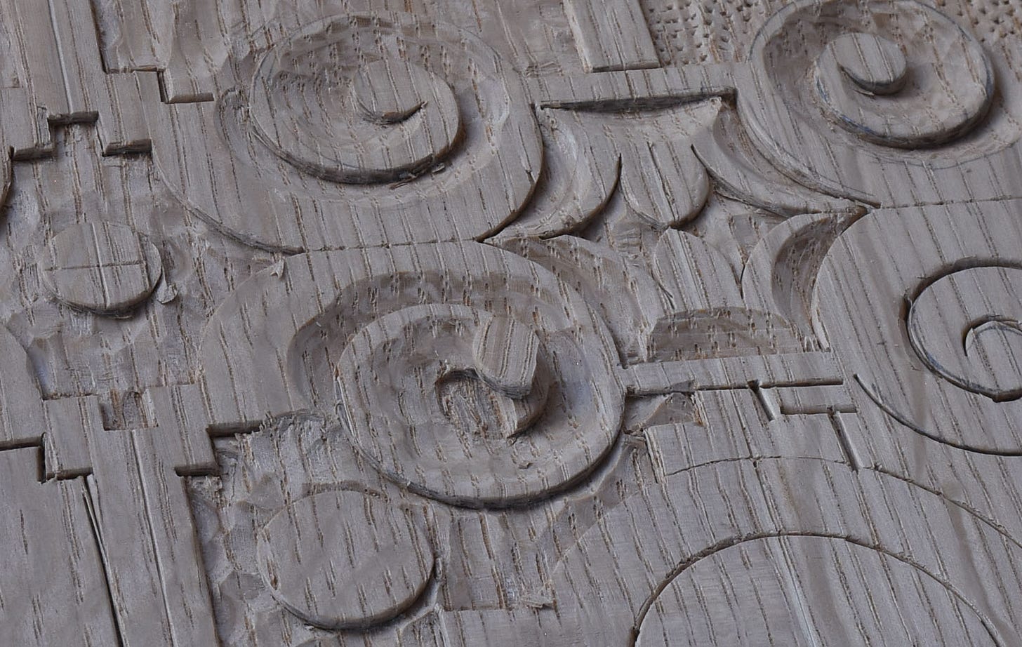 These pinwheels are some of the most difficult parts to carve. There’s only a few cuts from a gouge- the trick is doing it without blowing through the whole piece. And - there’s 48 of these on the whole panel - some larger, some smaller. The one in the photo above is about 1” in diameter - up to the right from it is a slightly smaller one-to-be..