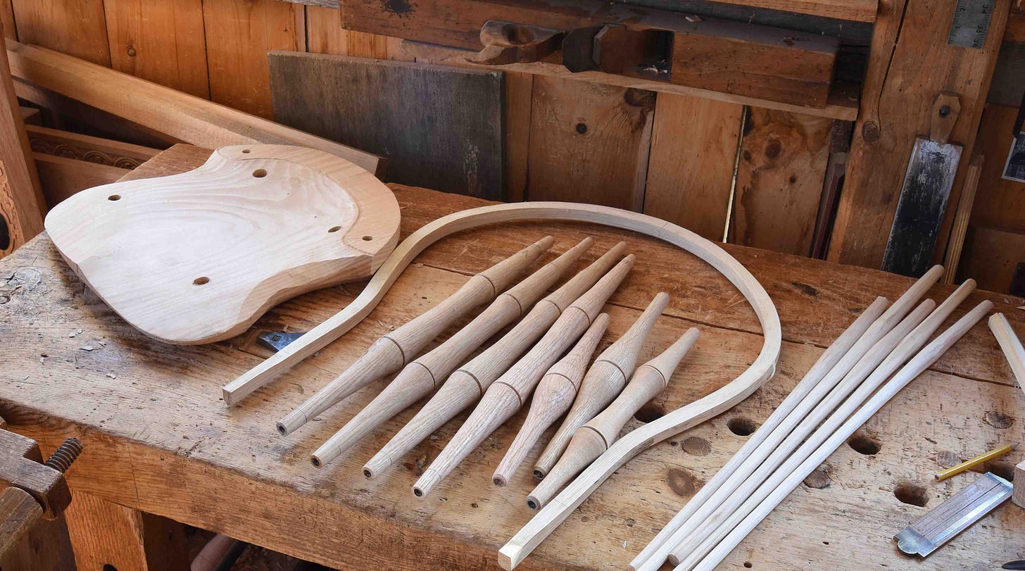 A while back I carved a seat to try my hand at a thumbback Windsor chair. Turned the legs - then stopped. Only because I had several parts for a bowback Windsor made - the seat, the turned legs and the bent bow. Decided to finish that one before I dove into a chair I’ve never built before. Turned the stretchers yesterday, now to dry the tenons and assemble the undercarriage. I’m not a Windsor chair maker, but I try to be someone who sometimes makes Windsor chairs. But I need to do it more often if I want to get anywhere at it.
